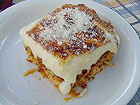 – Tepsiben, egy réteg sült padlizsán, krumpli és cukkiniszeletek, egy réteg megpirított ízesített darált hús, és fölötte besamelkrém.