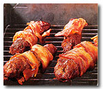 A darált marhahúst sózzuk, borsozzuk és a tojásfehérjét hozzáadva összedolgozzuk, nyolc egyenlő részre osztjuk és jégszekrénybe téve lehűtjük. Közben a zöldborsót sós vízben megfőzzük, lehűtjük, a sárgarépát és a hagymát finomra vágjuk vagy lereszeljük és a borsóhoz adjuk. Összekeverjük, fűszerezzük sóval, borssal. A lehűtött húst téglalap formára nyújtjuk, egyenként megkenjük mustárral, egyenletesen elosztjuk rá a zöldséget és óvatosan feltekerve rudakat formázunk, majd betekerjük a szalonnaszeletekbe, amelyeket fogvájóval összetűzünk. Izzó parázs felett többször megforgatva készre sütjük. Lehűtött vegyes salátával adhatjuk.