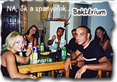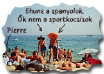 Azon az estén két csillogó fogú spanyolt küldtek értünk egy kétszemélyes sportautóval. Csodálkoztunk is, de aztán Barbapapa módjára sikerült bepréselődnünk a kocsiba, és Sangriával a kezünkben, irányt vettünk a spanyolok hotelje felé. Mulatságos este volt és felettébb gyorsan eltelt. Egyikük, -aki szerintem fodrász volt , mert a haja pont úgy nézett ki, mint a baktériumnak a meséből- tíz percen belül az asztal alá itta magát, a többi spanyol meg, ezt durcásan észrevéve igyekvően behozta a lemaradást, aztán állhattunk az utcán széttárt karokkal.