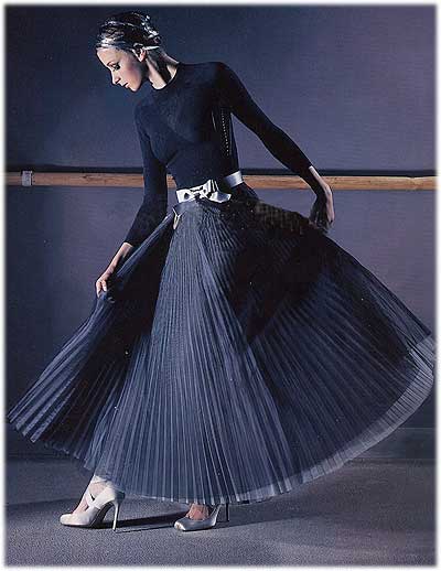 Ezek a mini hosszúságú tütü helyett bokáig érő, többrétegű, pillekönnyű, rakott tüllszoknyából és teljesen az alakra simuló felsőrészből állnak. Az együtteshez a balettcipők ihlette, keményített orrú szaténcipellő való. Ám e cipő nem lapos talpú, hanem tűsarkú.