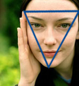 Az előző arcformával ellentétes. Homloka széles, álla keskeny. Eleme a levegő, bolygója a Merkúr. Szangvinikus vérmérsékletre utal. Az arcvonások kiegyensúlyozottak, az arc többnyire szimmetrikus. Bőre barna. Orra keskeny, alul kiszélesedő, nagy orrlyukakkal. A száj többnyire eltér az átlagostól: túl nagy vagy túl kicsi. A fordított háromszög legtöbbször hiperaktív embert jelez, akit már gyermekkorában tanfolyamról tanfolyamra cipeltek, hogy elfoglalják valahogy. Testileg és lelkileg is nyughatatlan. Mindig keresi az újat, állandóan tanul. Sok ismerőse van, de igen kevés barátja. A négyzetes arcú emberrel szemben a testi munka helyett a szellemi elfoglaltságot választja.