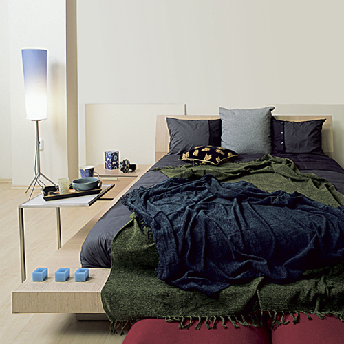 A kék hidegségét oldja, ha ebből a színből többféle, mélyebb árnyalatot is használunk. A mély tintakéktől kezdve a tompa szürkéskéken át az égszínkékig vannak változatok. A nyír semleges tónusa jó alapot kínál