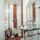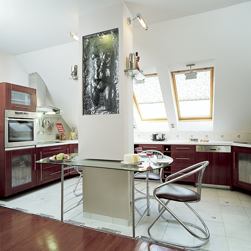 A tervező azonban a pillért térelválasztóként, látványelemként fogta fel, és tartószerkezetként is hasznosította. Piskóta alakú, gömbölyített végű üveglappal fogta közre az oszlopot, így az asztallap konyhai fele lett az étkező, a nappali felől pedig lerakópultként szolgál. A csővázas, mutatós székek nem új szerzemények, feketék voltak és kopottak, de egy kis ezüst festék szemmel láthatóan csodákra volt képes… Adott volt tehát a ferde falsíkok alatt körbefutó konyha bútorainak redwood furnéros alapanyaga, melyet a lakberendező matt krómkiegészítőkkel és egyszerű formákkal társított. Kivitelezése – akárcsak a lakás többi egyedi bútoráé – egy remek szakember, Orbán Tamás asztalos keze munkáját dicséri. Az egybefüggő térben a konyha meghatározta az összképet. Diszkrét ezüstmintával díszített, világos kővel borították a padlót és a pult fölötti falszakaszt, amelyet a nappalirészben a konyhabútor árnyalatával megegyező, különlegesen szép faburkolat vált fel. Enyhén lilás színt kaptak a falak, ami a hálóban teljesedik ki merészebb, valódi mályvaszínné.