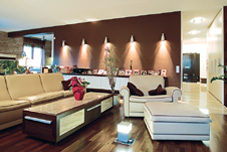 A többi helyiségben irányított és súrlófények, valamint padlófények világítják meg a teret. Az előtérből széles, kővel burkolt közlekedőn jutunk az elegáns nappaliba, ahol igazi kényelmet nyújt a szellősen elhelyezett, ötrészes, bézsszínű bőrrel kárpitozott ülőgarnitúra. Itt kapott helyet a házimozi-rendszer is, melynek hangfalai egyben a helyiség díszei. Látványos eleme a nappalinak a sötétbarna fal előtt csaknem teljes hosszúságban végigfutó, lebegő tároló. A tetején kialakított családi fotótárlatot a fal surlófényei teszik feltűnővé. A kanapé mögötti akvárium nem csupán látványosság, hanem térhatároló elem is. Itt kezdődik ugyanis az étkező. Ezt egyébként jelzi az is, hogy a nappalit borító keményfa szalagparketta hirtelen kőburkolatban folytatódik. A kör alakban elhelyezett garnitúra megbontja a tér túlzott szögletességét, a rengeteg zöld növény, a kertre nyíló ablakok pedig télikert jelleget kölcsönöznek a helyiségnek.