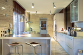 Mivel házigazdánk gyakran látja vendégül üzleti partnereit, barátait, szükség volt a nagy társasági élethez nélkülözhetetlen fogadótér kialakítására, illetve a jól felszerelt, tágas konyhára és az ehhez szervesen kapcsolódó étkezőre. Az impozáns méretű nappali és a vele egy légtérben lévő étkező tehát a gyakori rendezvények, fogadások színtere, így – a családi élet nyugalma érdekében – praktikusnak bizonyult a lakás túlsó felén kialakítani az intim szférát, melyet a fürdő-, a háló- és a gyerekszoba, valamint a gardrób alkotnak.