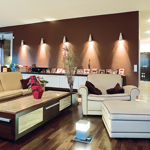 A többi helyiségben irányított és súrlófények, valamint padlófények világítják meg a teret. Az előtérből széles, kővel burkolt közlekedőn jutunk az elegáns nappaliba, ahol igazi kényelmet nyújt a szellősen elhelyezett, ötrészes, bézsszínű bőrrel kárpitozott ülőgarnitúra. Itt kapott helyet a házimozi-rendszer is, melynek hangfalai egyben a helyiség díszei. Látványos eleme a nappalinak a sötétbarna fal előtt csaknem teljes hosszúságban végigfutó, lebegő tároló. A tetején kialakított családi fotótárlatot a fal surlófényei teszik feltűnővé. A kanapé mögötti akvárium nem csupán látványosság, hanem térhatároló elem is. Itt kezdődik ugyanis az étkező. Ezt egyébként jelzi az is, hogy a nappalit borító keményfa szalagparketta hirtelen kőburkolatban folytatódik. A kör alakban elhelyezett garnitúra megbontja a tér túlzott szögletességét, a rengeteg zöld növény, a kertre nyíló ablakok pedig télikert jelleget kölcsönöznek a helyiségnek.