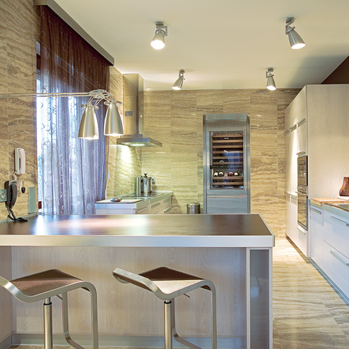 Mivel házigazdánk gyakran látja vendégül üzleti partnereit, barátait, szükség volt a nagy társasági élethez nélkülözhetetlen fogadótér kialakítására, illetve a jól felszerelt, tágas konyhára és az ehhez szervesen kapcsolódó étkezőre. Az impozáns méretű nappali és a vele egy légtérben lévő étkező tehát a gyakori rendezvények, fogadások színtere, így – a családi élet nyugalma érdekében – praktikusnak bizonyult a lakás túlsó felén kialakítani az intim szférát, melyet a fürdő-, a háló- és a gyerekszoba, valamint a gardrób alkotnak.