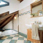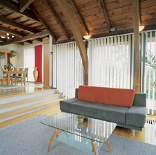 Leghangsúlyosabb eleme a térnek a sötétre pácolt fagerenda mennyezet, amely a modern berendezési tárgyak ellenére rusztikus ízt ad a helyiségnek. A fehér falakkal és a sötét gránitnégyzetekkel díszített, mészkővel, illetve hajópadlóval burkolt aljzattal kiegészítve mindez rendkívül tiszta, természetes hatást kelt. Ezt erősítik a tiszta, egyszerű alapszínek. Így a pompeivörös, amely egy-egy kiemelt falszakaszon a hálóban az ágy mögött, az étkezőben a falra erősített agyagkorsó hátterében, a gyerekszobában a falipolcot kihangsúlyozva jelenik meg, valamint a kék, illetve a kékesszürke, mely a konyhacsempén, a nyílászárókon, a kanapén, és a textilkiegészítőkön bukkan fel…