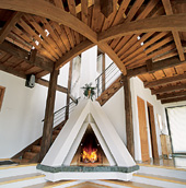Egyszerűség, természetesség és ötletes térjátékok ez a hármas egység követhető végig a ház minden helyiségében. Meghatározó elem az épület szívében, a földszinti nappali-étkező tengelyében felállított, körbejárható, háromszögekből építkező kandalló. A saját tervezésű, zárt égésterű tűzrakóhely dekoratív geometriai idomai sem pusztán a látvány kedvéért épültek, hanem füstelvezető, illetve hőleadó felületként is szolgálnak. A szürke gránitpárkányt ülőkének használják, ugyanakkor maga a kandallótest térelválasztóként is szolgál nappali és étkező között. A funkcióváltást tovább hangsúlyozza a szintkülönbség: a nappali társalgója néhány lépcsőfokkal lejjebb került, intimebbé téve így a modern, kékes-vöröses kanapéval, üvegasztallal berendezett teret.