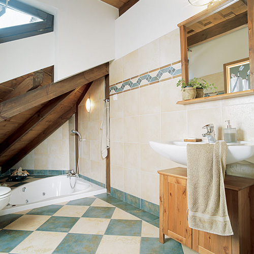 Leghangsúlyosabb eleme a térnek a sötétre pácolt fagerenda mennyezet, amely a modern berendezési tárgyak ellenére rusztikus ízt ad a helyiségnek. A fehér falakkal és a sötét gránitnégyzetekkel díszített, mészkővel, illetve hajópadlóval burkolt aljzattal kiegészítve mindez rendkívül tiszta, természetes hatást kelt. Ezt erősítik a tiszta, egyszerű alapszínek. Így a pompeivörös, amely egy-egy kiemelt falszakaszon a hálóban az ágy mögött, az étkezőben a falra erősített agyagkorsó hátterében, a gyerekszobában a falipolcot kihangsúlyozva jelenik meg, valamint a kék, illetve a kékesszürke, mely a konyhacsempén, a nyílászárókon, a kanapén, és a textilkiegészítőkön bukkan fel…