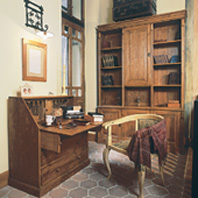 Követve a festmény tompa, természetes színeit, régies hangulatú, patinás bútorokkal berendezett enteriőrt alakítottunk ki.