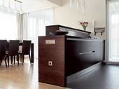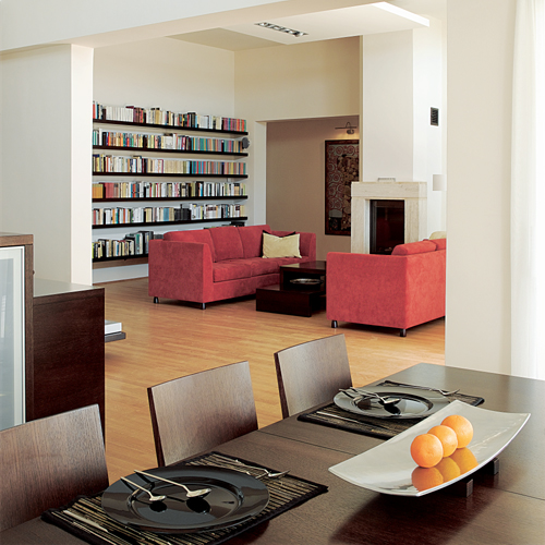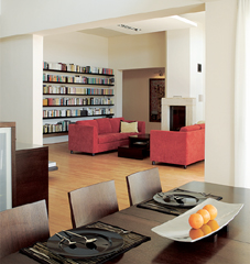 Vendéglátóink egy évvel ezelőtt költöztek a fővárosból vidékre. Előző, sötét, szűkös, bútorokkal telezsúfolt lakásukból tágas, világos, áttekinthető otthonra vágytak, ezért korábbi munkái alapján Kajdócsi Jenő építészt kérték fel arra, hogy házat tervezzen számukra. Kajdócsi maradéktalanul megoldotta a feladatot: olyan épületet tervezett, melyben minden funkció logikusan követi egymást, jól elkülönülnek az intim és a közösségi terek, és amely a lehető legjobban kihasználja a telek adottságait. A megfelelő tájolásnak köszönhetően a nappali-étkező-konyha terébe egész nap árad a fény (ami persze egyáltalán nem azt jelenti, hogy a hálószobák sötétek lennének).
