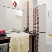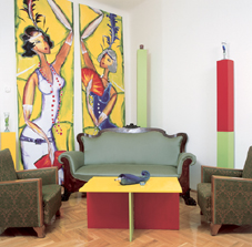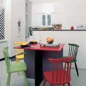 Adott volt négy fából készült, fehér szék, ezek mindegyikét más-más színre festették. A hozzájuk tervezett, egyedileg gyártott étkezőasztalnak pedig már az összeállítása is díszletszerű. A baráti összejöveteleknek ugyanis fénypontja az, amikor a falról leakasztott színes, modern képeket vagyis az asztal elemeit néhány mozdulattal egymásba illesztik. A piros, lilásszürke és sötétzöld elemek asztallap és két láb használaton kívül a falon absztrakt műalkotásnak tűnnek, és nem foglalják fölöslegesen a teret, a színes székek pedig térbe állítva, a szobában szétszórva teszik izgalmassá a látványt. Mindezt a rikítóra festett posztamensjellegű CD- és DVD-tárolók egészítik ki. Belül üreges, egyik oldaláról nyitott hasábok ezek, melyek polcként működnek. Mivel az aljukra a lakkozott parkettán könynyen csúszó filckorongot ragasztottak, s ha éppen nincs szükség a tartalmukra, akkor arccal a fal felé fordulnak. Tetejükre stílusosan Darabos Anita színes, kecses üvegszobrai kerültek. Az összhatás mintha Mondrian* képeit idézné. Egyedi és meghökkentő.