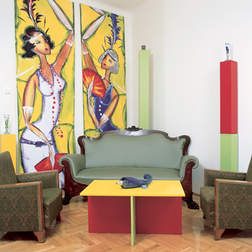 Adott volt négy fából készült, fehér szék, ezek mindegyikét más-más színre festették. A hozzájuk tervezett, egyedileg gyártott étkezőasztalnak pedig már az összeállítása is díszletszerű. A baráti összejöveteleknek ugyanis fénypontja az, amikor a falról leakasztott színes, modern képeket vagyis az asztal elemeit néhány mozdulattal egymásba illesztik. A piros, lilásszürke és sötétzöld elemek asztallap és két láb használaton kívül a falon absztrakt műalkotásnak tűnnek, és nem foglalják fölöslegesen a teret, a színes székek pedig térbe állítva, a szobában szétszórva teszik izgalmassá a látványt. Mindezt a rikítóra festett posztamensjellegű CD- és DVD-tárolók egészítik ki. Belül üreges, egyik oldaláról nyitott hasábok ezek, melyek polcként működnek. Mivel az aljukra a lakkozott parkettán könynyen csúszó filckorongot ragasztottak, s ha éppen nincs szükség a tartalmukra, akkor arccal a fal felé fordulnak. Tetejükre stílusosan Darabos Anita színes, kecses üvegszobrai kerültek. Az összhatás mintha Mondrian* képeit idézné. Egyedi és meghökkentő.