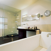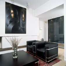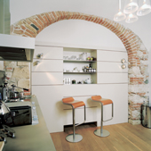 Már az előtérbe lépve grandiózus látvány fogad. A több száz éves falak, a boltívek, a vakablak és az Olaszországból származó, sötétbarna, óriás mészkőlapok, a lebegni látszó áttört szerkezetű falba kapcsolt öntött betonlépcsők és a gondosan megkomponált fényjáték élménye több mint tökéletes. Az innen nyíló – wengefurnéros, minimál bútorokkal, fémlábas, sötétbarna, bőrkárpitos székekkel berendezett – ebédlő visszafogottsága mellett remekül érvényesül a középkori falfülkék íveinek szépsége. Valamikor, hajdanán itt lehetett a ház kapubejárata… A fehérre festett falak, a semleges, tölgyparketta, az egyszerű függöny mind-mind a letisztultság érzetét erősítik és finoman jelzik, hogy nem kívánnak tolakodóan előtérbe kerülni. Ellensúlyozza a bútorzat távolságtartó eleganciáját – a többi társával egyetemben – a Kilim Szőnyegházban talált, különlegesen szép keleti szőnyeg, mely mintha a ház török időkbe visszanyúló múltjára is emlékeztetne…