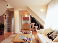 Ezek remekül oldják az Ebedli Gyula belsőépítész által kialakított, tiszta, geometrikus rendet és semleges anyaghasználatot. A világjáró üzletember azért kereste meg Ebedli Gyula belsőépítészt, hogy újonnan vásárolt, szerkezetkész lakásának beosztását tegye használhatóbbá, és igényeinek megfelelően alakítsa ki otthonát, lehetőleg természetes anyagok használatával. A cél az volt, hogy lendületes, ugyanakkor kényelmes és harmonikus tereket hozzanak létre, kihasználva a lakás természetes fényviszonyait. A belső­építész alapfeladata tehát a tér újraszervezése volt úgy, hogy a főbb funkciókat nagyságrendileg helyesen osszák el, és ugyanakkor őrizzék meg a nappali-konyha-étkező egy légterű hármasát. A tér legérzékenyebb pontja a tetőteraszra vezető lépcső volt, mely a lakás centrumában, a nappali közepén helyezkedik el. A tervező ragaszkodott a lépcső sziluettjének megnöveléséhez, mely ezáltal nemcsak használhatóbb arányrendszerű lett, de a tér egyik meghatározó formai elemévé is vált. Az új lépcső szépen, szabályosan ível fel­felé, formai pontosságát a betonnal kiöntött, egyedi gyártású acélszerkezet biztosítja. Háttérfala, a konyha- és kéményfal egy tömeget képez, melynek geometrikus formavilágát a bontott tégla használata teszi hangsúlyossá. Meghatározza a nappali teret a két betonpillér is, melyeket gipsz hengerpalásttal vontak be – így a szerkezeti elemeket egyúttal látványelemekké is alakította a belsőépítész. Az oszlopok formájára rímelnek a negyedköríves üvegtégla falak, melyek persze nem csak esztétikai megfontolásból kerültek ide. Egyikük az előszobát és a vendégmosdót különíti el a nappalitól, másikuk az intim szférát – a hálószobát, fürdőt, dolgozót és gardróbot – választja el a közösségi terektől.