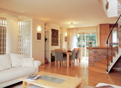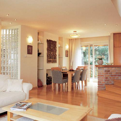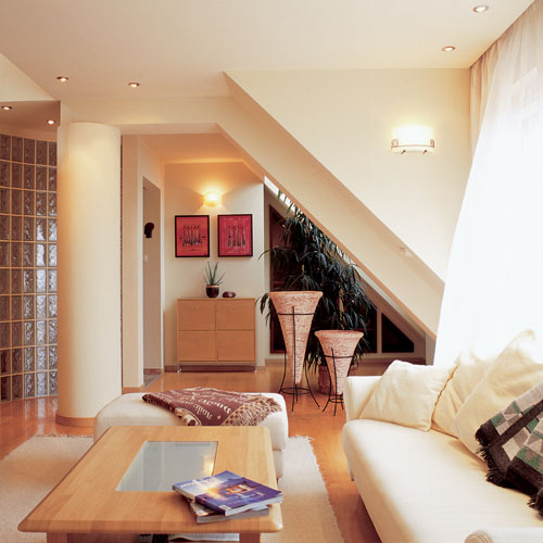 A tetőtéri szint zártságát oldották azáltal, hogy megduplázták a tetőtéri ablakok számát, így a lakást minden oldalról átjárja ­a fény­. A megrendelő külön kérése volt, hogy a teraszra nyíló étkező falán egy izgalmas, vonzó felületet alakítsanak ki. Ezt rejtett világítással, rusztikus homokkővel bélelt falfülkékkel, lebegő üvegpolcokkal valósították meg. A mediterrán jellegű, mégis modern látványelem izgalmas kontrasztban áll az afrikai fafaragással és az elegáns étkezőgarnitúrával. Érdemes az ötletes bútorozásra külön is figyelni. Hiszen mivel a lakás benapozás szempontjából értékesebb oldala éppen a tetősík alatt helyezkedik el, kihívást jelentett a megfelelő darabok kiválasztása. Az ülőbútorok és az étkezőgarnitúra kivételével szinte az összes többi elem, így a tárolószekrény és a polc is egyedi tervezést igényelt. A ferde sík alatt kialakult tereket a könyvespolcok és az afrikai szobroknak kialakított, megvilágítható falmélyedések foglalták el.