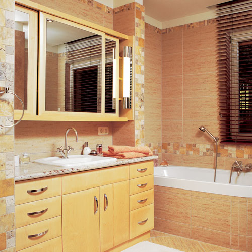 A lakás intim szférájának éke a jó hangulatú fürdőszoba, ahol a mészkőburkolat és a jávorfa mosdószekrény képviselik a ter­mészetes anyagokat. Amilyen kicsi ez a für­dő, olyan funkcionális. A mosdó és vécé mellett kád és épített zuhanyfülke is van­, a szekrények mögött pedig mosógép és szárítógép is elfért.