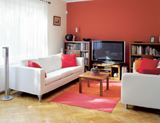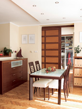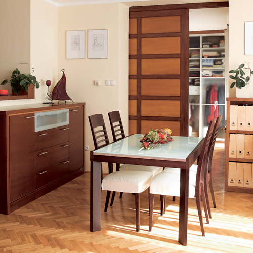 Mivel az alapterület csupán hatvan négyzetméter, egyszerű vonalú, illetve méretre gyártott bútorokra volt szükség. Pothorszki László bútorasztalos munkája a nappali-étkezőrészben lévő összes tárolóbútor, melyek közül kiemelendő darabnak számít a tálalószekrény a személyes igények alapján kialakított fiókrendszerével és rendkívül finom részletmegoldásaival. A Lamperth Angéla védjegyének is tekinthető vörös fal (mely minden általa tervezett lakásban visszaköszön), a tojáshéjszín oldalfalak, illetve a méretre készült szekrények és polcok adták azt az alapot, melyhez a kazettás tolóajtó Barger Károly asztalos munkája , az étkezőasztal és a franciaágy készültek, sötét dió árnyalatban.