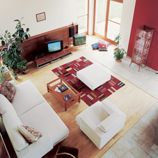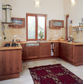 Mindezt úgy formába önteni, hogy a valóságban is jól működő, tetszetős képet mutató épületet kapjanak, időbe telt. Szerencsére Új Viktor, a frissen végzett építészmérnök tökéletes együttműködő partnernek bizonyult Egyértelmű volt, hogy a földszinten nem fogják fölösleges válaszfalak zavarni a térélményt. Az építész specialitása, a hosszú, lőrésszerű nyílásokkal átláthatóvá tett falak alkalmazása tovább fokozza a szellősséget, és olyan teret eredményez, amelynek minden szegletét beragyogja az extra magasságú, óriási ablakokon át beömlő napsütés. Gyakorlatilag száműzték a házból a belső ajtókat is, eltekintve természetesen azoktól a helyiségektől, amelyek intimitására időnként szükség van. Ezekre cseresznyefurnéros, fa nyílászárók kerültek. Vöröses, meleg árnyalatuk meghatározta az egész berendezést. Így az U alakú konyha bútorát is, melyet a háziasszony rajzai alapján a Falomb Bt. asztalosa, Piesko Csaba készített, akárcsak a radiátortakarást. Cseresznyeszínűek a készen vett, designbútorok is, az olasz étkezőgarnitúrát a Bohémia üzletében, míg a minimál stílusú tévéállványt a Mazza Diffusione bemutatótermében találták, a hófehér és nagyon elegáns, extra mély ülőfelületű garnitúrával egyetemben.