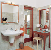Nem véletlenül döntött a lakberendező a világos, egyszínű kárpit mellett: a fehér, illetve vörösbarna felületek tiszta harmóniáját helyenként váratlan, erős kontrasztokkal tarkították, dinamikát adva a térnek. Meggypirosra festették a nappaliban a keskeny vitrin mögötti falszakaszt az élénk árnyalat a Kilim Szőnyegházban vásárolt, gyönyörű, keleti szőnyegek, párnák szövetének mintázatában bukkan fel ismét. Ugyanilyen ellenpontnak szánták magát a hálószobát is, melynek falai erős narancsszínben tündökölnek, összehangolva az ágytakaró, a faliszőnyeg és a kilépőszőnyeg tónusaival. A világos háttámlás, modern franciaágy kellemesen elüt a harsány háttértől, a függöny színe megegyezik a faléval.