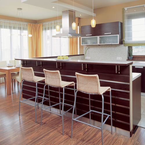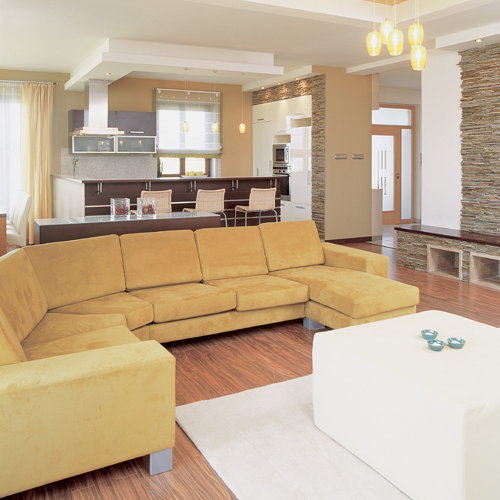 A ház centrumában a földszinti nappali áll, a család itt tölti ideje nagy részét. Tekintélyes helyet foglal el belőle a modern gépekkel felszerelt konyhasziget és az étkező. Semmi sem öncélú itt, minden tárgynak fontos szerepe van. Azt, hogy valójában két különböző funkciójú helyiségben járunk, csupán a burkolatok eltérő anyagai – a kony­hában kő, a nap­paliban parketta – és a tagolt, gipszkarton álmennyezet jelzik. Az egész falat beborító, natúr kőburkolat síkját a beépített konyhabútorok, illetve a nappali oldalán a kan­dalló töri meg. Mivel a társalgó berendezése csak egy sarokkanapéból, egy bőrpuffból és néhány falra függesztett tárolóból áll, érvényesülnek a helyiség impozáns méretei.