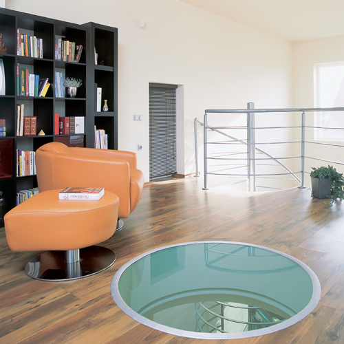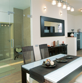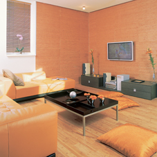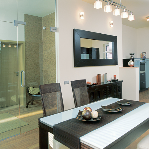 A lakást teljes egészében földszinten és emeleten is gyönyörű, meleg árnyalatú bambuszpadlóval burkolták, mely jól bírja a padlófűtést, s a vizes helyiségekben a nedvességet is. Ráadásul remek alapot biztosít a nappali és a hálók barátságos, otthonosabb hangulatú berendezésének csakúgy, mint az étkező és dolgozó hűvösebbre hangolt világának. Az egységes burkolat a tér tágasságérzetét is növeli, s a bambusz*, ez a meleg hatású, egzotikus és mégis elegáns, természetes anyag falburkolatok formájában is vissza-visszaköszön. Hatalmas üvegfelület választja le a belépő terét az egybefüggő étkező-nappalitól. Ez a megoldás egyszerre látványos és praktikus: útját állja a kintről beáramló hideg levegőnek, de az egységes tér látványát cseppet sem zavarja. A konyhát csupán egy térbe nyúló parapetfal meg egy praktikus konyhasziget különíti el, ahol a főzőlap és egy kényelmes munkafelület kapott helyet. A B1 Konyhastúdió sötét színű beépített bútorainak komolyságát remekül oldja a falburkolatként használt festett üveglap vidám narancssárgája, mely rímel a szintén narancsszínűre hangolt nappalira. A beépítés egyszerű vonalai, minimalista eleganciája pedig a sötét színű Calligaris étkezőbútorok az üveglapos asztal és a kárpitozott támlás székek megjelenésével harmonizál. A természetes hangulatot itt a kőhatású tapétával borított falszakasz is biztosítja, mely az előtér hasonló falburkolatára köszön vissza. Alacsony tálaló és hatalmas, fény- és térnövelő tükör egészíti ki a berendezést. Szinte harsányan vidám formavilágának köszönhetően azonban mégis visszafogott és modern a nappali, narancssárga bőrgarnitúrájával, szögletes dohányzóasztalával. A falat díszítő dekoráció, mely színvilágában és hangulatában kifejezetten ide illik, a lakberendező, Bozovich Sonja saját alkotása.