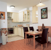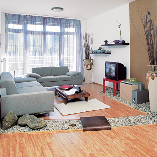 A lakás adottságai közé tartozik, hogy már a bejárati ajtóból belátni szinte az egészet, hiszen a fürdő- és hálószoba válaszfalaitól eltekintve egybefügg a tér. Hogy az egyes funkciókat mégis elkülönítsék, a lakberendező egy különleges, a teret kanyargósan átszelő kavicsfolyót tervezett ide, amely a meglévő laminált padlóra került. A kavics „vízválasztón” egy szimbolikus kis híd ível át a társalgó felé, jelképezve, hogy nem csupán a fizikai akadályok, de a mindennapi gondok is áthidalhatók… Magát a hidat – a szép, japános ihletésű dohányzóasztallal egyetemben – Darabos Anita készítette egy lomtalanításkor talált, biedermeier ágyvégből. A modern vonalvezetésű ülőgarnitúrát, akárcsak az étkező bútorait, a ház asszonya vásárolta korábban, és ezek kiindulópontként szolgáltak az enteriőr megkomponálásakor. A szürkés homokszínű bútorkárpit a kavicsok árnyalatát ismétli – ez adta az ötletet a belső „japánkert” megteremtésére. A vizet idézi a kék organzafüggöny, mely elé csipeszekkel bambuszszemekből fűzött gyöngyfüggöny szálakat lógattak fel. Így minden mozdulatra, szellőrezdülésre másként táncol a „víztükör”,