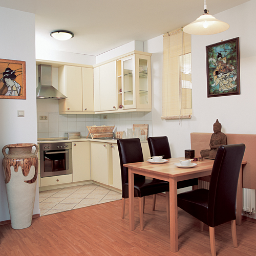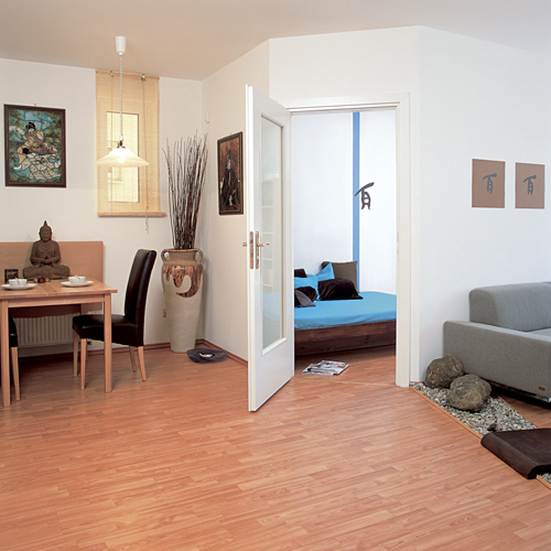 Vendéglátónk, az egyedülálló fiatal hölgy úgy gondolta, nem kívánja jellegtelen környezetben leélni az elkövetkező éveket, bár csupán bérlője otthonának, egy budai, ötven négyzetméteres lakásnak. Ezért kereste meg Darabos Anitát – aki üvegtervező iparművészként és lakberendezőként is ismert –, hogy segítsen megoldani a nehéz feladatot. Nem kívánt sok pénzt költeni az átalakításra, az amúgy jó állapotban lévő teret csak olyan elemekkel akarta különlegessé tenni, amelyek szükség esetén bármikor könnyedén eltávolíthatók, visszaállítva az eredeti állapotot. Mivel a meg­rendelő fiatal, modern gondolkodású, és imád távoli földrészekre utazni, a tervező egy kis egzotikus, japános hangulattal tette egyedivé az egyszerű vonalú bútorokkal berendezett enteriőrt.