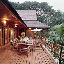 Vendéglátóink háza hűen követi e vidék íratlan szabályait. A közvetlenül egy kis folyó partján álló épület földszintjén a raktárhelyiségek találhatók. Itt tárolják a kerti bútorokat, a szerszámokat, a csónakokat, a kerékpárokat és a hűtést nem igénylő, tartós élelmiszereket. Az élet valójában a kert fölött, a felső szinten zajlik. Ide került a nappali az étkezővel, a fürdők, a háló- és a vendégszobák. A thaiföldi lakóházak nélkülözhetetlen része a facölöpökön álló, az épületet körülvevő terasz, mely mindig mélyen a kertek fölé nyúlik. A konyha ahogy ez errefelé szokás egy melléképületben található, hogy a szagok ne zavarják a lakókat és a vendégeket. A főzés kevésbé, míg az étkezés nagyon is társasági esemény. Ezért az étkező tekintélyes méretű, és a nappalival együtt a ház centrumában áll.