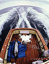 Egyik nap erős szél fújt, és barátom, Gildas, váltig állította, hogy most lesz csak igazán jó mulatság kimenni a vízre. Minden erőnket arra összpontosítottuk, hogy ellentartsunk a szélnek, és szinte teljes testünk kilógott a víz fölé. Hirtelen egy nagy szikla mellett haladtunk el, és hajónk így szélárnyékba került. A váratlan szélcsend és az eltolódott súlypont csaknem a hajó borulását okozta.
