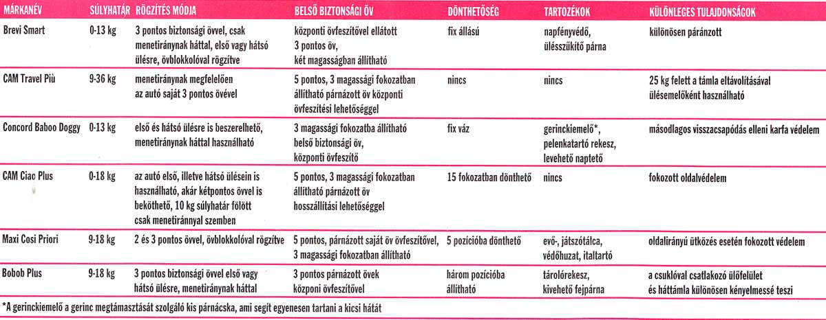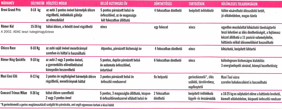 A biztonsági ülések használatának széleskörű elterjedésével párhuzamosan a szakboltok szolgáltatásai is egyre jobban igazodnak a vásárlók igényeihez. A szakmailag felkészült személyzet a család utazási szokásainak, a gyerek életkorának és az autó adottságainak ismeretében ki tudja választani a több százból azt a néhány modellt, ami az egyéni igényeknek leginkább megfelel. Összeállításunkban részletesen bemutatunk néhány gyerekülést. Lapunk nem vállalhatja, hogy a piacon kapható összes terméket ismertesse, de nagy segítséget nyújthat abban, hogy a legfontosabb tulajdonságokra és lehetőségekre felhívja a leendő vásárlók figyelmét.