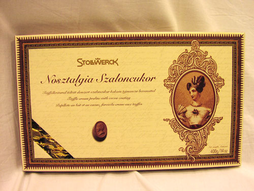 Bár a sok-sok cukorka kóstolása közben elérkeztünk az émelygés szintjére, semmiképp sem állhattunk meg a trüffelkrémmel töltött desszert előtt. Doboza elegáns, párunk szüleinek bátran vihetünk belőle. A papírt nem könnyű kibontani, de feltétlen nézzük meg mit rejt! Egy Sassoon frizurás hölgy profilját…