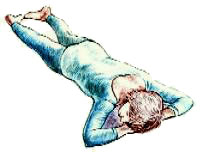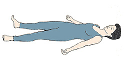Kezeinket a fejünk alá tesszük, a vállainkat is ellazítjuk. A nagylábujjainkat összeérintjük, sarkainkat hagyjuk kifelé billenni.
