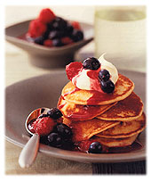 5. A fekete áfonyát tegyük egy tálba, és keverjük össze a mézzel. Adjuk hozzá a málnát, és a gyümölcsöket törjük kissé össze, néhány szemet egészben hagyva. Tálaljuk a kis palacsintákat melegen a mézes gyümölcskeverékkel és friss-sajttal. (Hát itt jöhetnek az egyéni variációk bármiféle gyümölccsel, lekvárral, juharsziruppal. A lehetőségek tárháza végtelen)