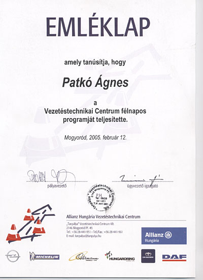 Köszönjük a lehetőséget az Allianz Hungária Vezetéstechnikai Centrumnak és az instrukciókat Pesoldt Ferencnek, aki kitartóan bíztatta a Fittipaldi-jelölteket.