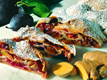 A tésztát belisztezett abroszra tesszük és kézhát segítségével hajszálvékonyra nyújtjuk, a széleket levágjuk. A szilva-mandula-gyömbér keveréket a tésztán egyenletesen szétosztjuk.