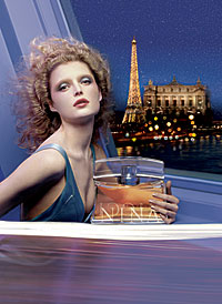 Egyszerű, mégis elegáns üveg látványa fogadott: követve a külső burok stílusát, az üveg nyakán két egymásba fonódó ezüst gyűrű díszeleg. Biztos a szerelmesek egymásba fonódását akarja szimbolizálni, és így akár azt is ráfoghatnám, hogy az üveg Párizs, a benne lévő anyag pedig a szerelem. Igen, és kezdek is hasonlítani egy kisdiákhoz, aki irodalom órán elemzi a művet naneee! Menjünk inkább tovább! Finom, lekerekített szélek az egyébként inkább téglalaphoz közelítő formán, az egyik oldalán Nina, a másikon pedig Ricci felirattal ékesítve. Az üvegben pedig borostyánsárga színben pompázik az illatkreáció maga.