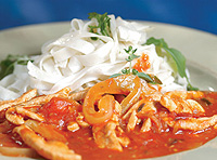 A paradicsomot cikkekre vágjuk, a paprikát kicsumázzuk és csíkokra vágjuk, a csirkemellet felcsíkozzuk. A felaprított hagymát forró olajon megizzasztjuk, majd hozzáadjuk a zúzott fokhagymát. Hozzáadjuk a csirkehúst, megpirítjuk, aztán hozzádobjuk a paradicsomot és a paprikát. Felöntjük 4 dl hideg vízzel, elkeverjük a KNORR Mediterrán csirke alappal, felforraljuk. Mérsékelt tűzön 10-15 perc alatt készre főzzük.