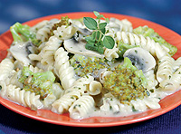 A fusilli tésztát sós vízben megfőzzük. A brokkolit gőz fölött röviden megpároljuk, szűrőben hideg víz alatt lehűtjük, lecsepegtetve félretesszük. A gombákat megtisztítjuk, az olajon addig pároljuk, míg levüket elforrják. Ekkor felöntjük 4 dl vízzel, és elkeverjük a KNORR Serpenyős gombás csirke alappal. Néhány percig forraljuk, amíg besűrűsödik. Összekeverjük a lecsepegtetett főtt tésztával, a brokkolival és röviden összemelegítjük.