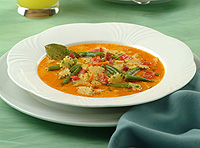 A kockára vágott füstölt szalonna zsírját kiolvasztjuk, a tűzről levéve kicsit hűlni hagyjuk. Hozzáadjuk a zúzott fokhagymát és a fűszerpaprikát, a tűzre visszatéve pár pillantig pirítjuk, majd hozzádajuk a zöldbabot, babérlevelet, kevés vizet. Félpuhulásig pároljuk, majd rászórjuk a morzsolt tárkonyt, felöntjük 1 liter forró vízzel és hozzáadjuk a tasak tartalmát. A tasakon olavsottak szerint készre főzzük a levest. Tálalás előtt hozzáadjuk a tejfölt és a hámozott kiskockára vágott paradicsomot. Még frissebbé varázsolhatjuk levesünket ha finomra vágott, friss, cserepes tárkonylevéllel szórjuk meg tálaláskor.
