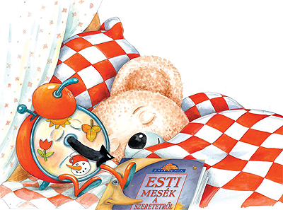 Csak a füle hegye látszott ki a piros és fehér kockák alól. (Megjegyzem, mindig nagy gondot fordított arra, hogy semmi se hibádzzon a téli álom körül!) Az odúnak volt ablaka is, de azon most összehúzták a függönyt – nyilván azért, hogy ne jöjjön be a fény. Az ágy mellett éjjeliszekrény állt, rajta egy mesekönyv (azt olvasgatta hónapokkal ezelőtt Coccolino, aztán belealudt az olvasásba), és még volt ott egy vekker is. Nos, ez a vekker (teljes nevén: Ébresztőóra) valamikor a tél végén elromlott, nem csengetett, nem berregett, meg se nyikkant, egyetlen mukkot sem adott ki magából, úgyhogy Coccolino – akinek a csörgésre rég fel kellett volna ébrednie, mint minden valamirevaló medvének – még mindig mélyen aludt.