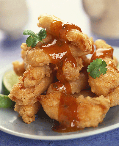 A csirke: két tojás sárgájából, vízből és a lisztből készítsünk sűrű palacsintatésztát, melyet a felvert tojásfehérjével lazítunk. Szórjuk bele a koriandert, sózzuk meg kissé, majd mártsuk bele a vékony csíkokra vágott csirkemellet és bő, forró olajban süssük ki. Chilis szósszal tálaljuk.
