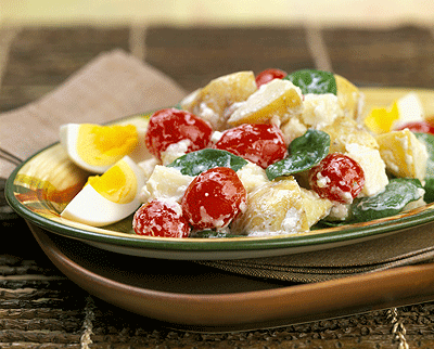 Sós vízben nagyjából 15 perc alatt főzzük meg az újburgonyát, hűtsük le hideg vízzel, majd hámozzuk meg és vágjuk egyforma darabokra. Egy nagyobb tálba tegyük a megtisztított koktélparadicsomokkal együtt. Szórjuk rá a bazsalikomleveleket, törjünk rá egy kis borsot, és locsoljuk meg egy kevés olívaolajjal. Tálalás előtt öntözzük meg behűtött majonézzel.