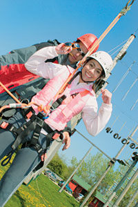 Ezután a bátor jelentkezők megtanulták, hogyan bújjanak bele a védőfelszerelésbe, és milyen biztonsági szabályokat kell betartaniuk a pályán, hiszen a karabinerek helyes átkapcsolása, a biztosítókötelek állandó ellenőrzése, egymás folyamatos figyelemmel tartása komoly odafigyelést kíván. A pályán párosával kell haladni, sőt, kizárólag így lehet boldogulni. A kalandra a koronát az óriáshinta tette fel. A tízméteres kötélen, mint egy liánon hintáztak a résztvevők, így tapasztalva meg a szabadesés mámorító élményét.