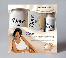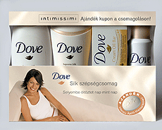 A csomagok a már jól ismert Dove Supreme Silk termékek mellett ajándék Dove Intenzív Ápoló Szappant és 10 ill. 20% kedvezményre jogosító kupont tartalmaznak, amelyek az Intimissimi állandó fehérnemű-kollekcójából történő vásárlásál válthatók be.