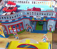 Hát, mit is mondjak? Gyönge két óra alatt felhúztuk a szerelőcsarnokot mosdóval, fagyiautomatával együtt. A tetejét azonban már nem volt erőnk… A rengeteg fülecske, és a rájuk váró számtalan kis nyílás, bevallom, elgyöngített… Ugyanis az alapozás idején kellő tapasztalatra tettem szert, nagyon nehéz a füleket szépen feszesre beilleszteni, nagyon nehéz bizonyos fülekhez hozzáférni. Így sajnálom, de a mosdó válaszfala iszonyú csáléra sikeredett, és szánom-bánom, de a frontoldali fal sem lett az a világbajnok.