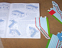 Olló és ragasztó nélkül – mormoltuk, miközben elkezdtük szétszabkodni a füzetet. Aztán egy ollót mégiscsak elő kellett venni. Ugyanis ha nem szépen szabtunk, akkor a kis fülek nem tudtak átcsusszanni a nyílásokon… Ja igen. Merthogy a papírlapokon vannak a darabok síkban, amiből építünk egy épületet térben, és mindezeket úgy rögzítjük, hogy a sík lapok szélein található füleket belegyömöszöljük a megfelelő helyen levő nyílásokba.