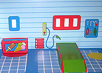 Az olló mellé előkaptam egy celluxot is, az utolsó simítások miatt, úgy éreztem, szükségem lesz rá. A szerelőműhely alján levő kis füleket ügyesen a talpazathoz simítottam, megerősítettem a feljárót, és megragaszgattam a tetején található neonra hajazó kis motívumot. Ez ugyanis kissé megsínylette az ollótlan szabkodást…