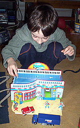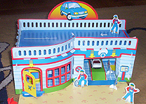 Otthon aztán kinyitottuk a füzetet, ami nem szép mesekönyv (húha, ennyi pénzért hogyan is lehetne), nem is jópofa munkafüzet, és még csak nem is színező! Egy vadiúj valami, aminek – mint a fedlapon írja – az a lényege, hogy sem olló, sem ragasztó, mégis összeállíthatod, amit a címoldalon látsz. A gyerek máris sorolta, hogy: „Képzeld, volt babaház és tanya, de ez, ez a szerelőcsarnok, én ezt szeretném!” És hozzáteszi: „Most!”